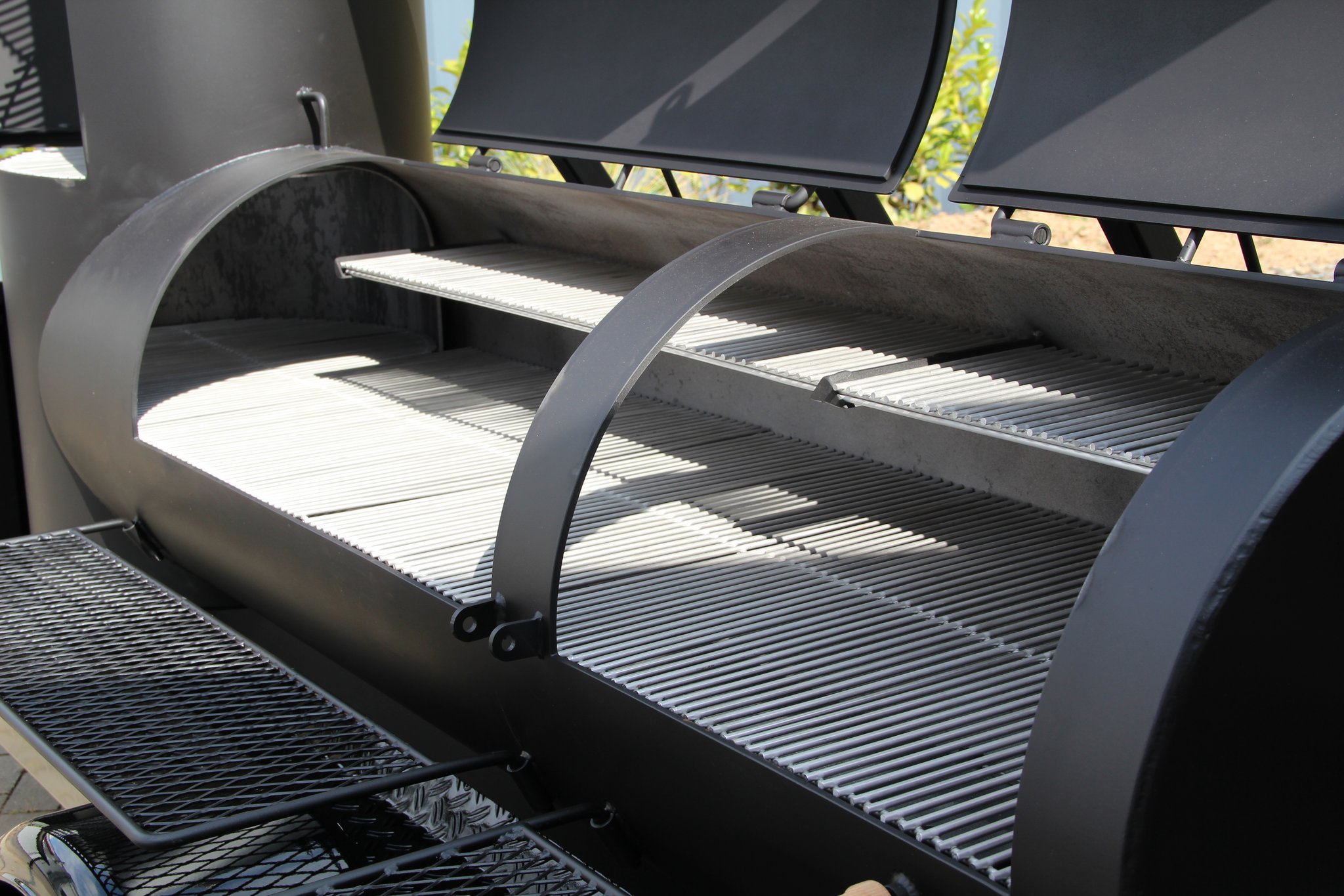 Zwei waagerechte Grillkammern mit zweiter Rostebene und Kontergewichten auf den Deckeln